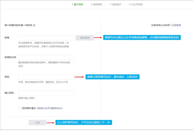 公眾號分:訂閱號、服務(wù)號、小程序三種帳號類型,注意注意1個郵箱只能注冊1個帳號。