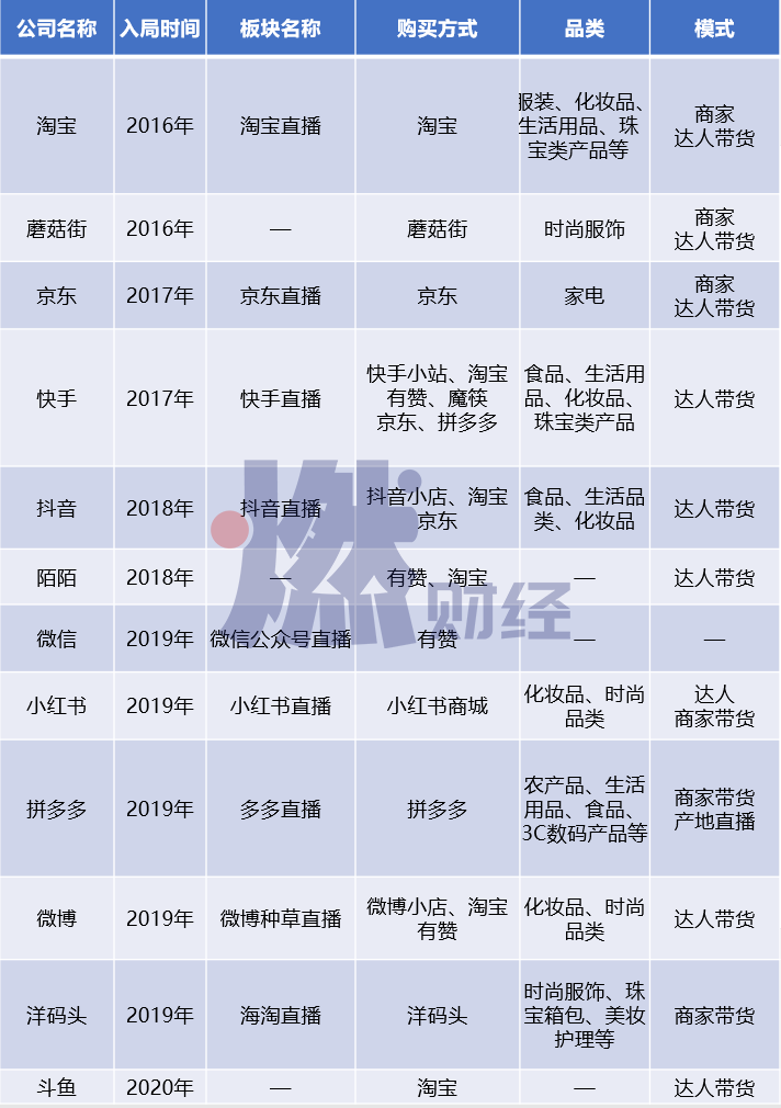 老牌玩家競爭激烈,新的玩家還在陸續(xù)涌入。燃財(cái)經(jīng)根據(jù)公開信息,整理出一份入局直播電商的不完全名單。