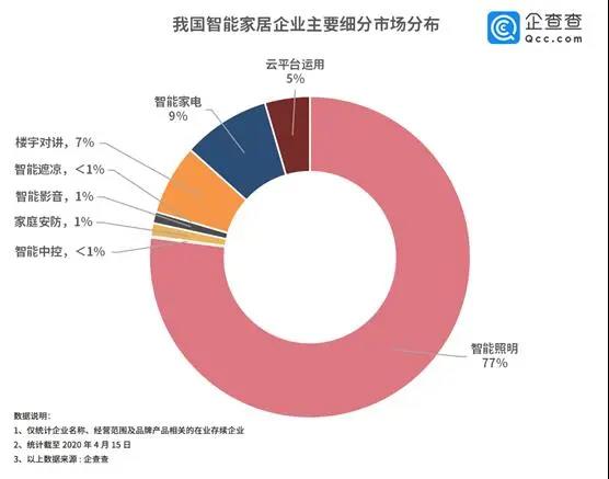 家電不再是冷冰冰的擺設(shè),而是被賦予了審美和情感需求的個性化智能產(chǎn)品。智能家居作為新興行業(yè),其無接觸式的交互方式,給疫情期間的人民帶來安全、智能的生活體驗(yàn),其優(yōu)勢開始凸顯。企查查整理了我國智能家居企業(yè)八大細(xì)分市場,數(shù)據(jù)表明智能照明、智能家電、樓宇對講相關(guān)企業(yè)占比較高,分別為77%,9%,7%;此外,家庭安防和智能影音也頗受市場青睞。
