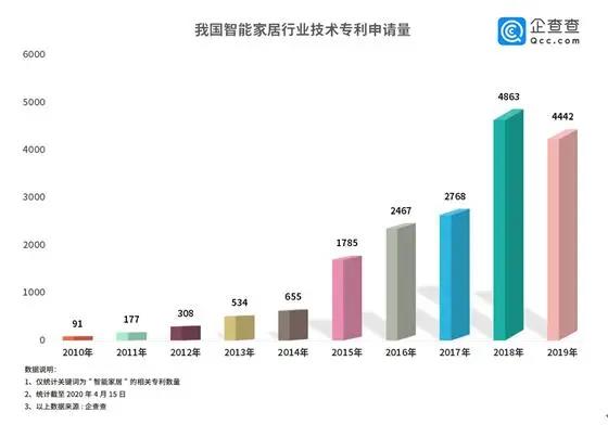 潛力巨大的“藍(lán)海”市場早已廠商云集,智能家居行業(yè)技術(shù)專利申請量迅速攀升。企查查數(shù)據(jù)顯示,我國智能家居相關(guān)專利申請總量早已破萬,2015年開始我國智能家居行業(yè)技術(shù)邁入快速發(fā)展期,2018年達(dá)到巔峰,數(shù)量達(dá)4863件,較2017年同比增長了76%,2019年專利申請數(shù)稍減。由此可見,智能家居市場競爭較為激烈,各路玩家步伐急促。