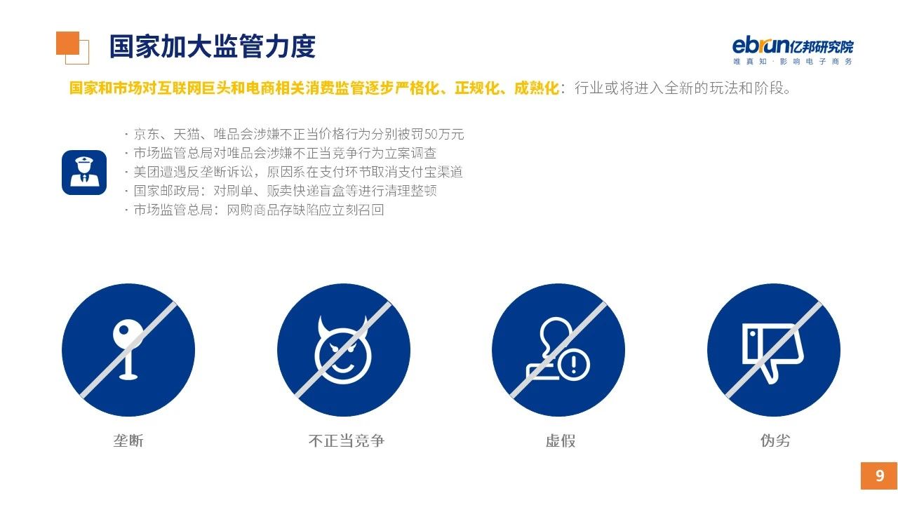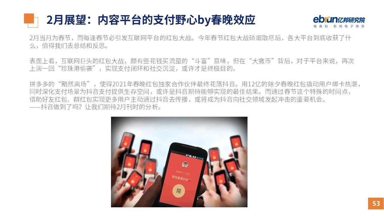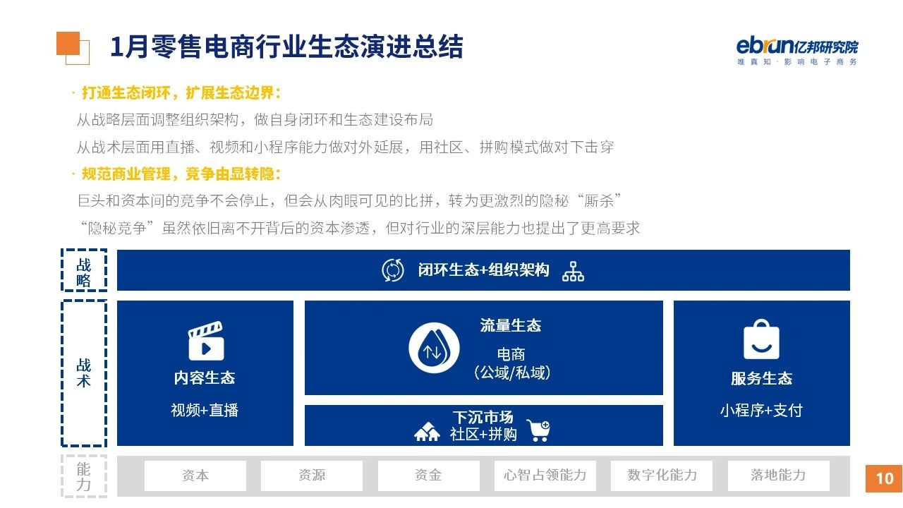 縱觀2021年1月,各平臺豐富自有生態(tài)布局,如淘寶直播(點淘)加入短視頻模式、騰訊重押視頻號、快手加碼電商和小程序、抖音推出支付等;視頻內(nèi)容成為各平臺未來重點發(fā)力方向;“九不得”新規(guī)發(fā)布后社區(qū)團購仍熱情不減;國家和市場對互聯(lián)網(wǎng)巨頭和電商相關(guān)消費加大監(jiān)管力度……你信和不信,你知道和不知道的,都在這份億邦動力研究院正式發(fā)布的